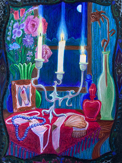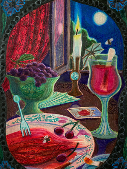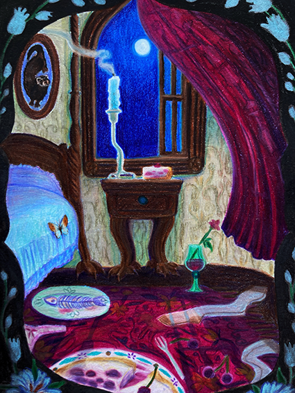 From L to R: Lover, Gluttony, Polecat. A5, Coloured pencils & oil pastels on paper. 2025